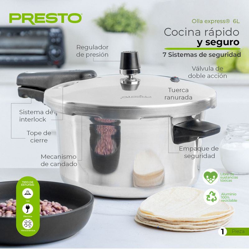 • Reduce el tiempo que dedicas a cocinar tus platillos favoritos con la Olla Express Presto. Su capacidad de 6 litros y sus 5 sistemas de seguridad te brindarán una cocción rápida, confiable y segura.